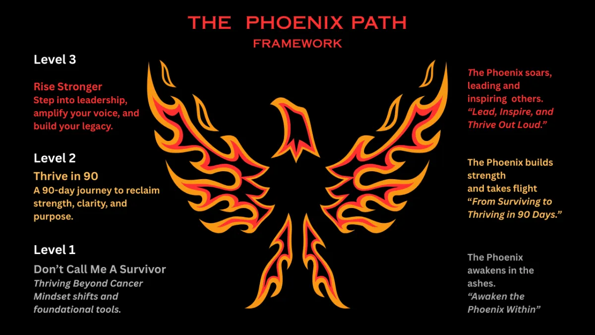 The Phoenix Path Framework is a journey of transformation designed to help cancer survivors move from surviving to thriving, and ultimately to leading and inspiring others. It starts with my book, Don’t Call Me A Survivor, which introduces the mindset shifts and tools to awaken your inner Phoenix. From there, the Thrive in 90 program takes you on a 90-day journey to reclaim your strength, clarity, and purpose. And for those who are ready to go even further, the Rise Stronger program helps you step into leadership, amplify your voice, and create a lasting legacy. Each level builds on the last, guiding you to rise stronger and live unapologetically as the person you were meant to be.